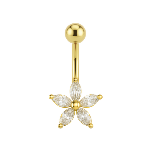 Crafted from high-quality 14K Gold, this elegant belly bar features a stunning flower design with sparkling marquise-cut stones. Its sleek and secu...