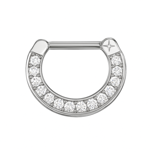 Showcasing a bold yet refined design, this 316L Surgical Steel septum clicker features a row of sparkling stones accented by polished beading. The ...