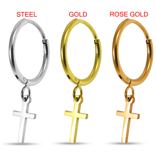 316L Surgical Steel CZ Jewelled Dangling Cross Hinged Earring Pair