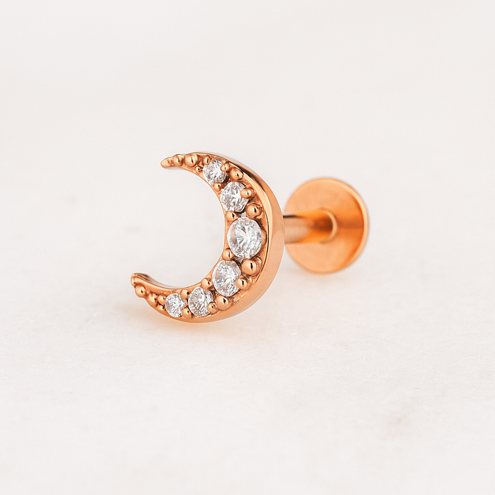 Enhance your piercing collection with this 316L Surgical Steel Flatback Labret featuring a sparkling jewelled crescent moon design. Perfect for cartilage, helix, and tragus piercings, it adds a delicate and stylish accent to any look. Ideal for everyday wear, combining elegance with lasting quality.