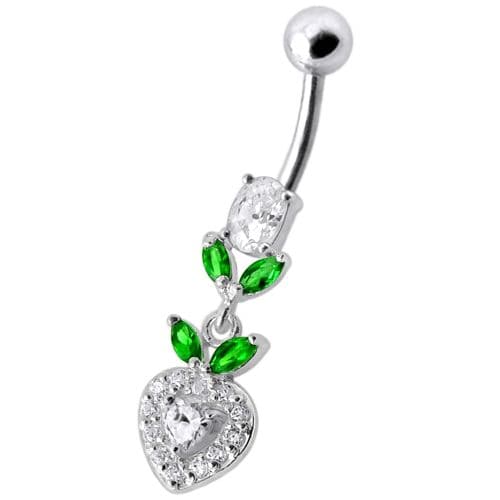 A charming belly ring featuring a drop design with a striking oval-cut stone above a heart-shaped pendant framed by smaller stones. Delicate leaf accents add a natural touch, creating a balanced and eye-catching look. Perfect for adding a distinctive element to your navel piercing jewellery collection.