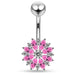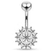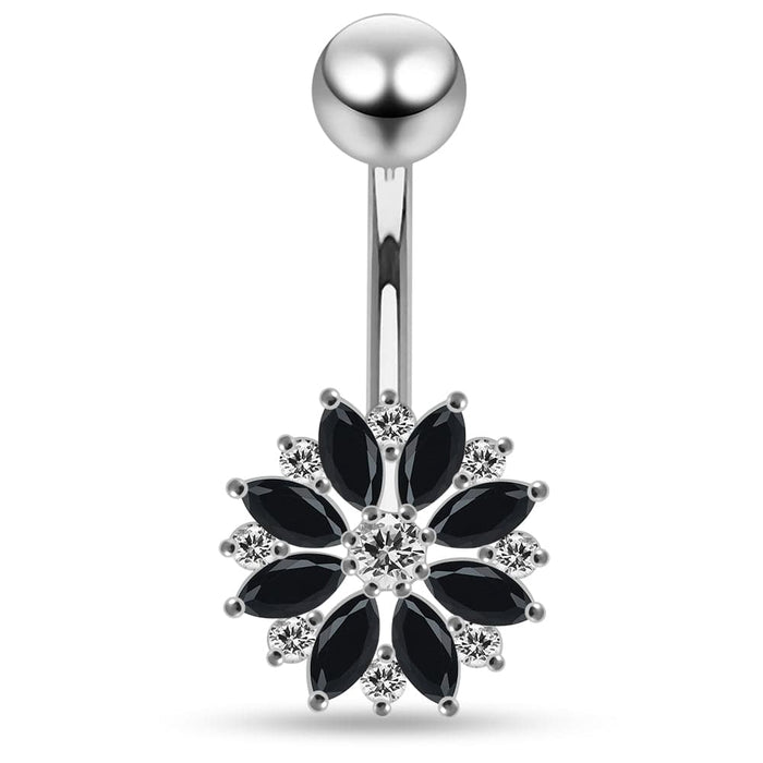 Bring a burst of brilliance to your look with this floral belly bar, adorned with marquise and round-cut cubic zirconia. The intricate petal arrangement creates a radiant, eye-catching effect, blending elegance with bold design for a striking addition to your piercing collection.