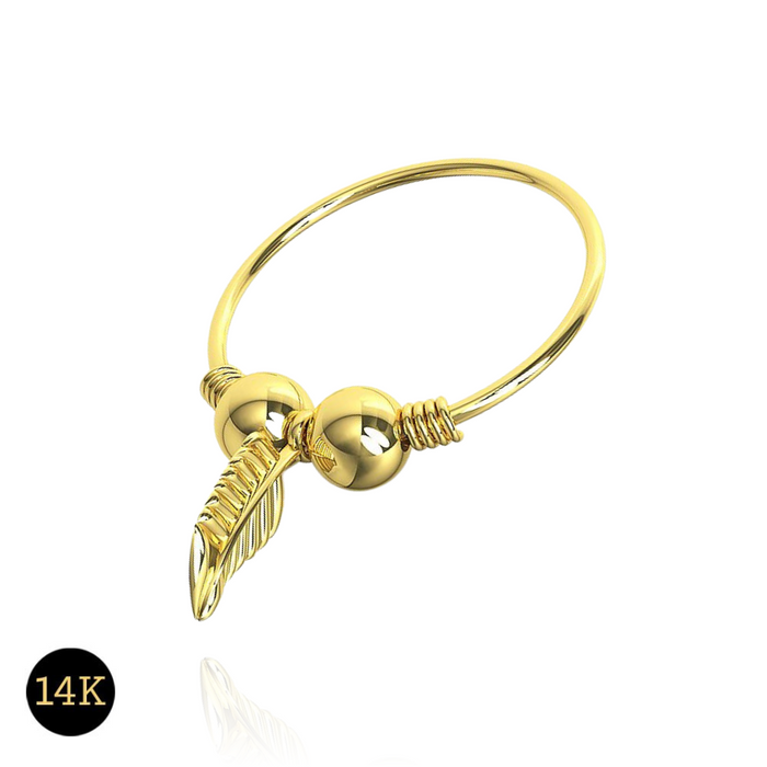 14K Gold Bead & Leaf Charm Nose Hoop Ring