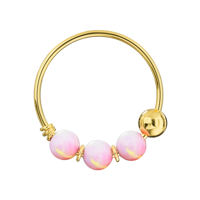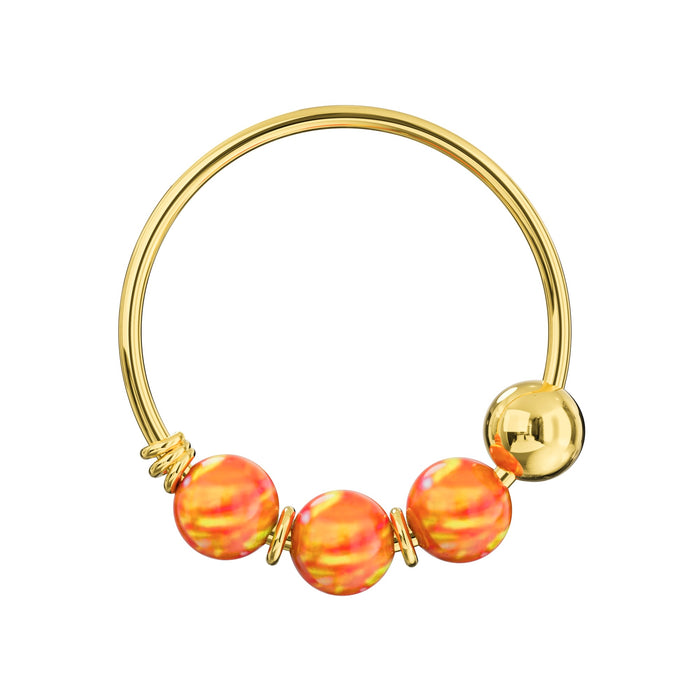 Introduce a splash of vibrant colour with this hoop crafted from 14K Gold, featuring three stunning blue opal beads. The smooth, polished finish complements the vivid stones, creating a unique and eye-catching accessory. Perfect for adding a pop of colour to your everyday jewellery collection.