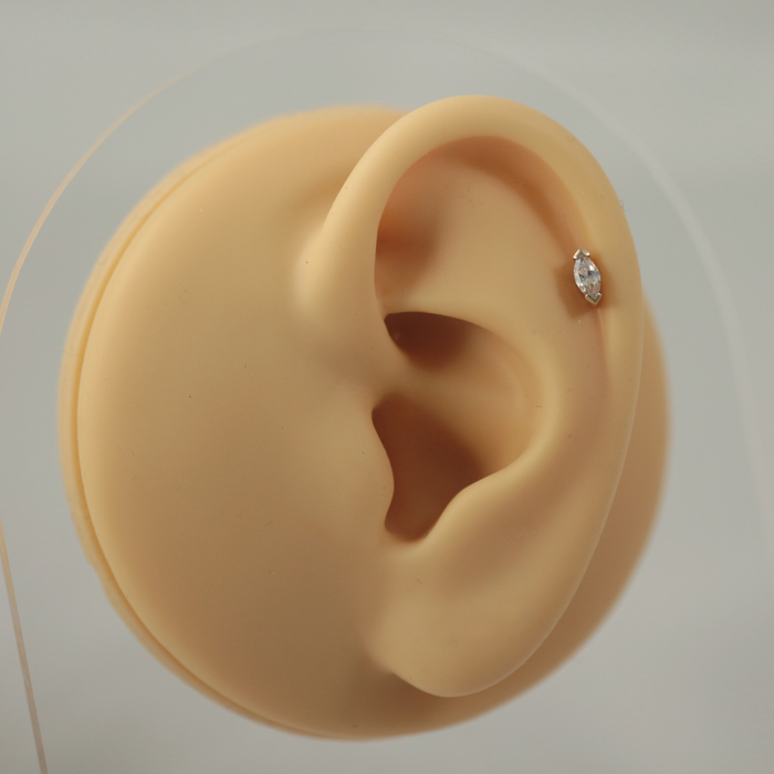 The elegant stud showcases a brilliant marquise-cut crystal secured with refined prong settings in 14K gold. Its elongated shape offers a sleek, eye-catching profile. Ideal for cartilage, helix, or tragus piercings, adding a touch of luxe sparkle.