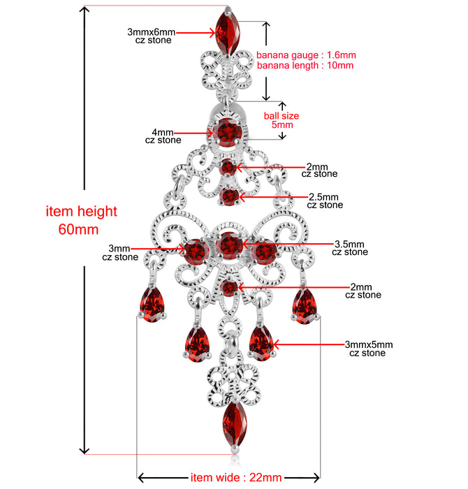 Add a touch of luxury to your look with this stunning silver belly bar, featuring an intricate filigree design adorned with dazzling ruby-red gemstones. The elegant chandelier-style drop creates eye-catching movement, perfect for special occasions or glamorous everyday wear. Crafted for comfort and beauty, this belly ring is a must-have addition to your jewellery collection.
