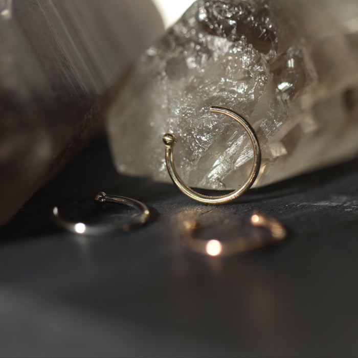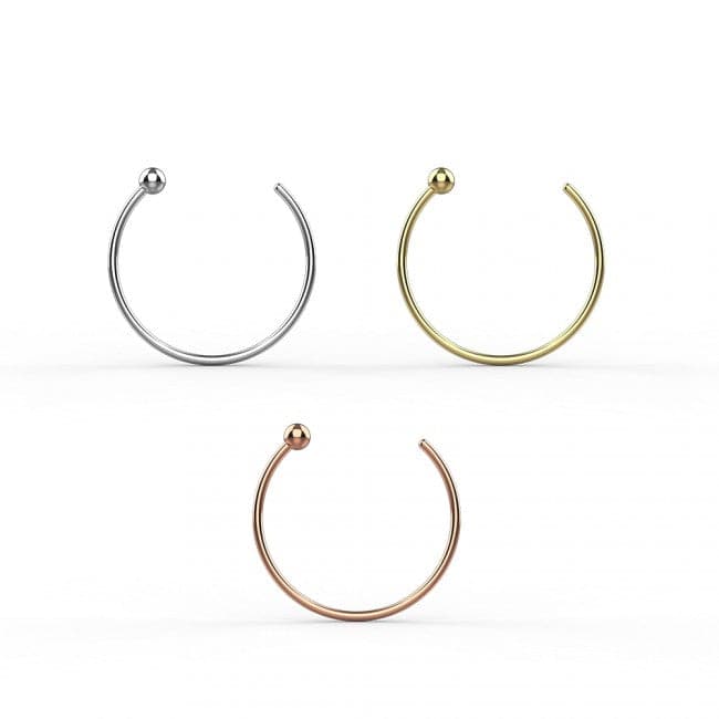 Delicate yet striking, this 9K Gold nose hoop features a minimalist ball detail for a timeless finish. Its open-end design ensures an easy fit and comfortable wear, making it a perfect everyday choice with subtle elegance.