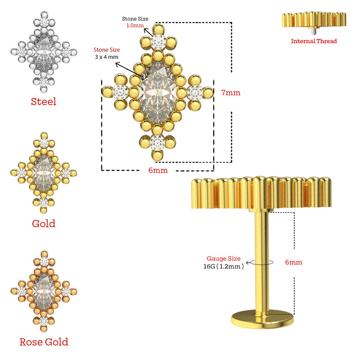 A bold and geometric design featuring a central marquise-cut cubic zirconia surrounded by smaller stones, set in a sleek 316L Surgical Steel base. The combination of smooth metal and sparkling stones creates a contemporary yet refined look. A standout piece that adds both style and elegance to any outfit.