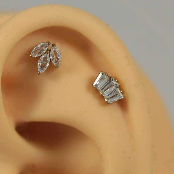 G23 Titanium Triple CZ Baguette Jewelled Internally Threaded Flatback Stud
