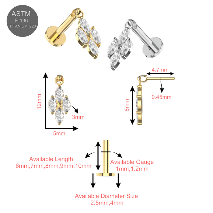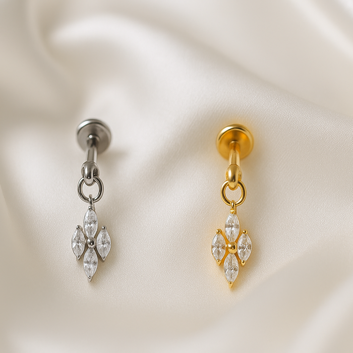 Add sparkle and elegance to your piercing collection with this marquise cluster labret stud, crafted from high-quality G 23 Titanium. Featuring four marquise-cut cubic zirconia stones arranged in a floral-inspired cluster, this push-fit is perfect for adding a touch of luxury to your Cartilage, helix, or tragus piercings. Available in gold and silver finishes, it combines modern design with timeless brilliance. The flat-back design ensures a secure and comfortable fit, ideal for daily wear. A must-have for lovers of refined, statement body jewellery.