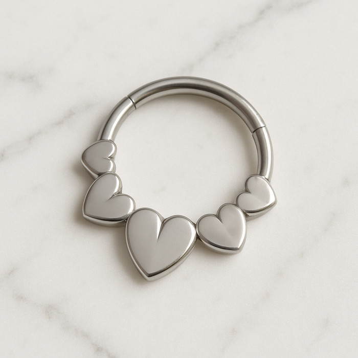 Crafted from high-quality G23 Titanium, this hinged segment ring combines strength and lightweight comfort for everyday wear. Featuring a charming design of interconnected hearts, it adds a delicate yet eye-catching touch to your piercing. Hypoallergenic and durable, this ring is perfect for septum, cartilage, or daith piercings, offering stylish, skin-friendly Titanium jewellery with a romantic flair.