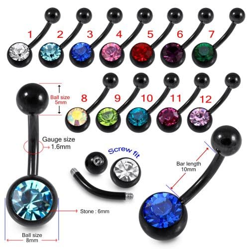 316L Surgical Steel Black Cubic Zirconia Studded Belly Ring